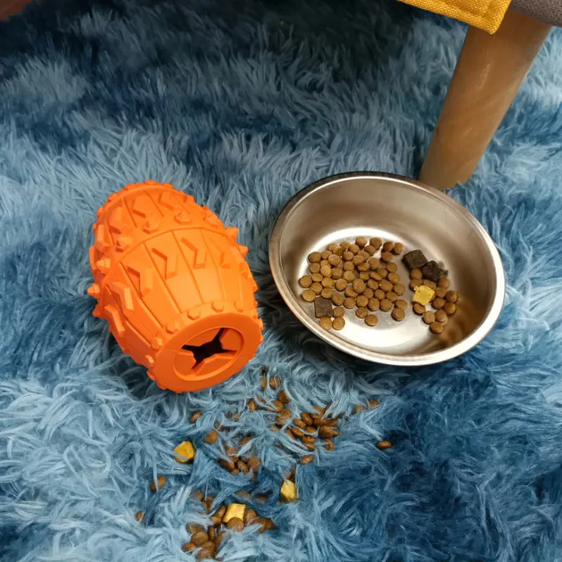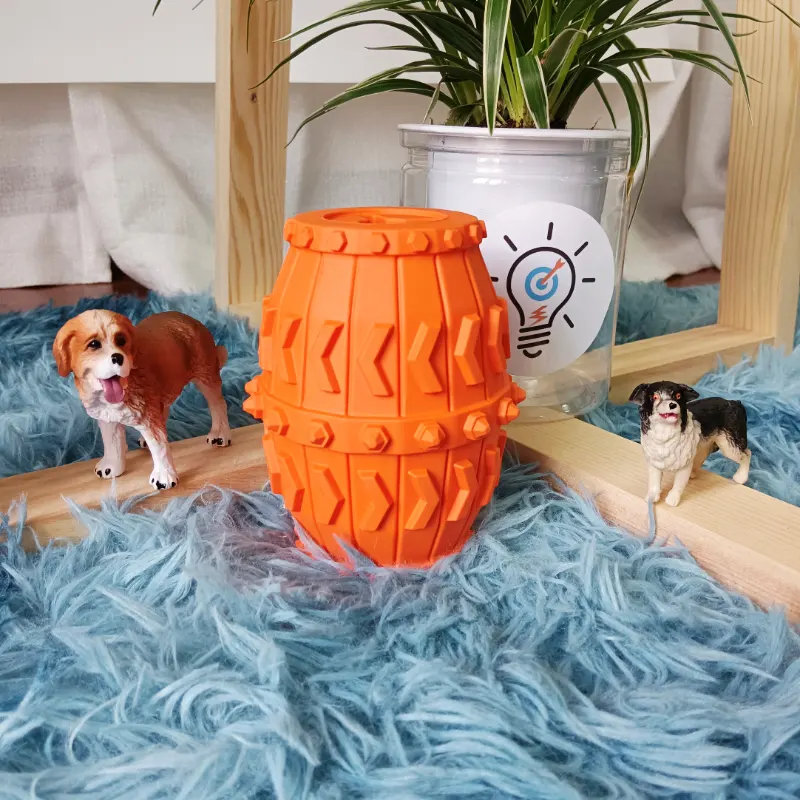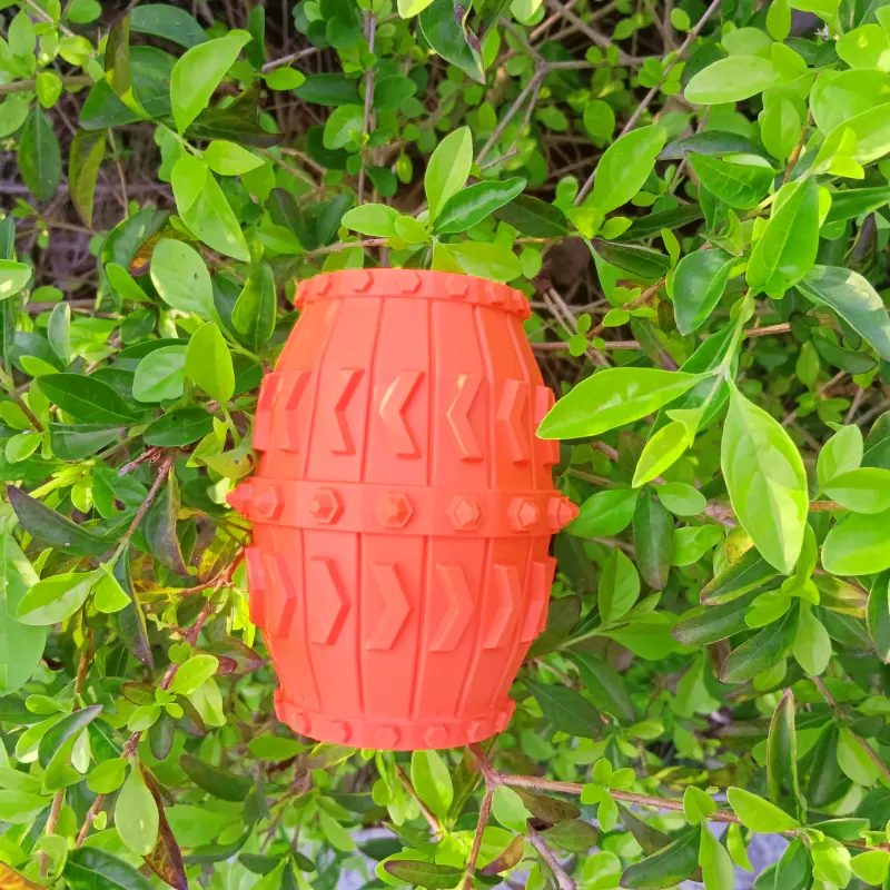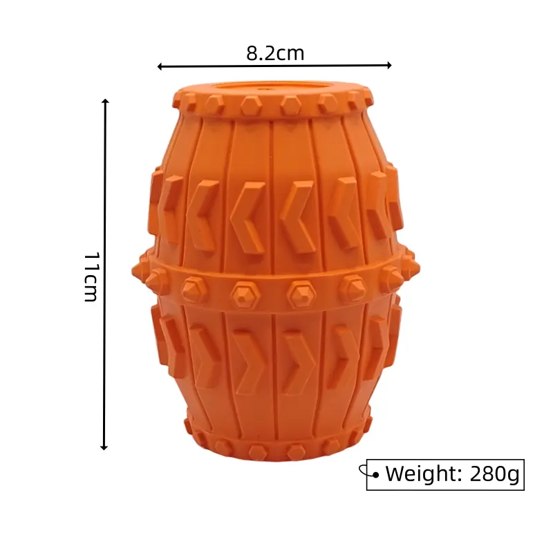 The big dog rubber chew toy features an adorable wine barrel shape, complete with intricate details that add charm to the toy. The top of the barrel is fitted with a convenient treat dispensing hole, allowing you to insert your dog's favorite treats or kibble. This enticing feature encourages your dog to stay interested in playing as they work to access the hidden treats inside.