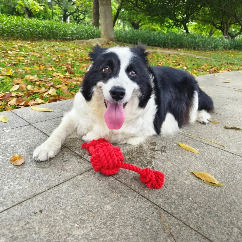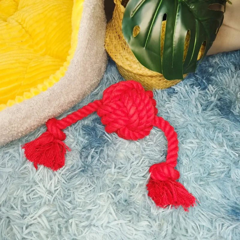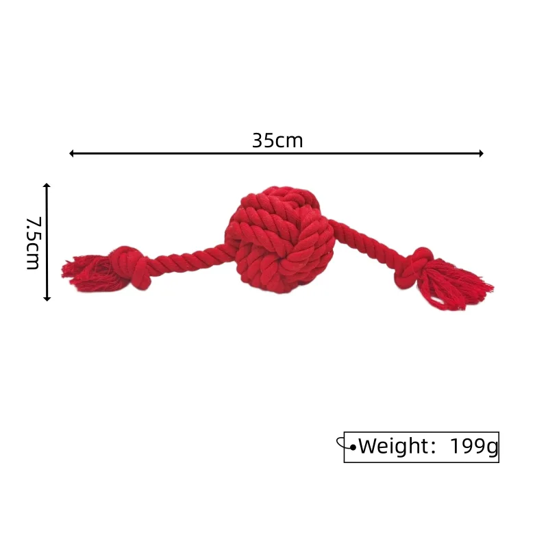 The red rope toy stands out with its striking red color and meticulous braided design, making it irresistible to small and medium-sized dogs. The two extended ropes add a dynamic element, encouraging playful interactions such as tugging, fetching, and shaking.
