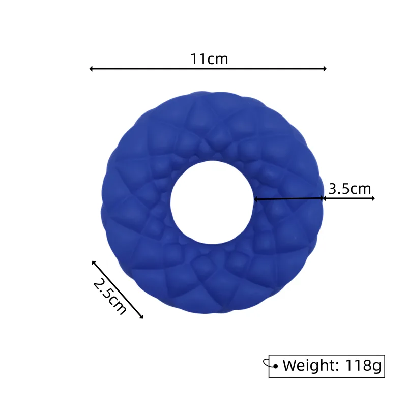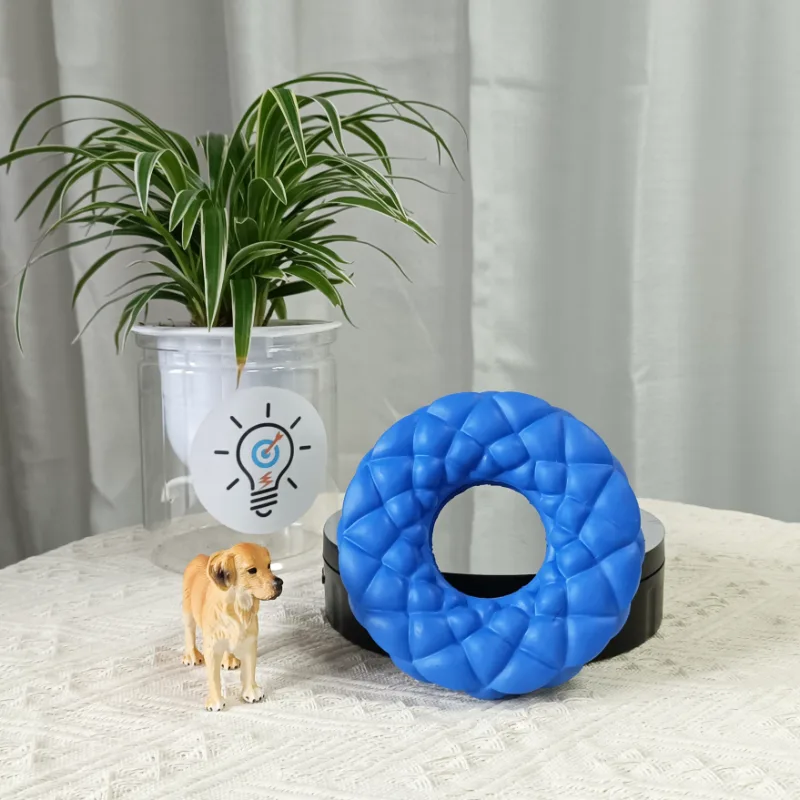 This chew toy features a small and adorable round ring design, resembling a miniature tire. The circular shape makes it easy for small dogs to grasp and carry around during play.