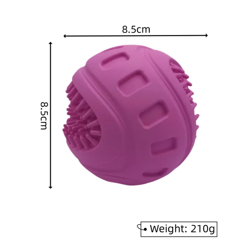 The interactive dog chew toys is a round rubber ball, slightly larger than a tennis ball, with a textured, raised surface covering its entire exterior. The raised surface is carefully crafted with soft yet durable rubber bristles, specially designed to help clean your dog's teeth and gums as they chew and play.