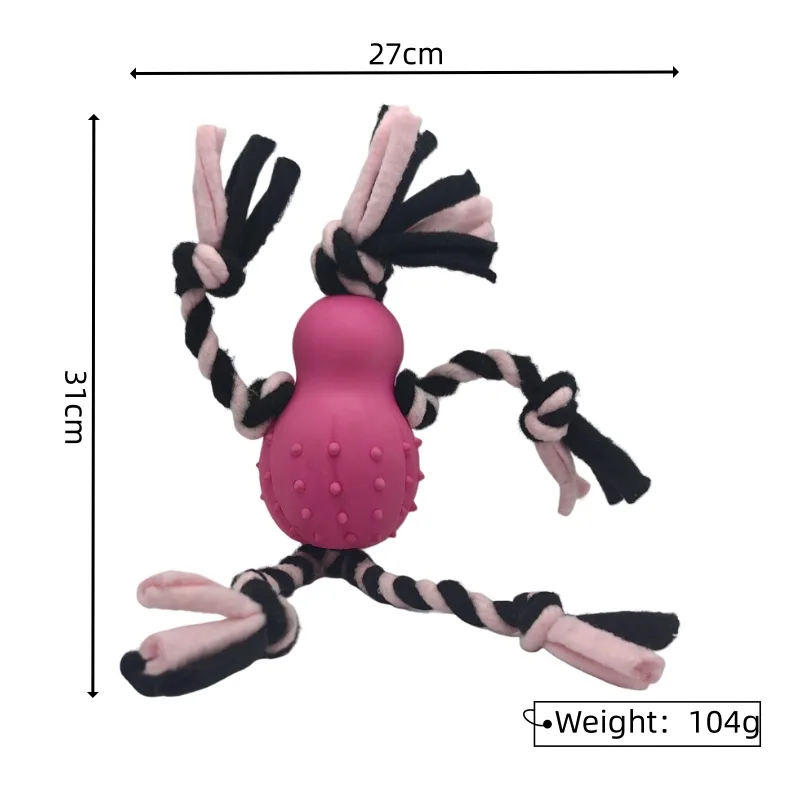 The toy's limbs and head are ingeniously made from two-color hemp ropes, enhancing the toy's visual appeal and overall uniqueness. The combination of rubber body and hemp rope limbs creates a delightful contrast, enticing your dog to interact and engage in playful activities.