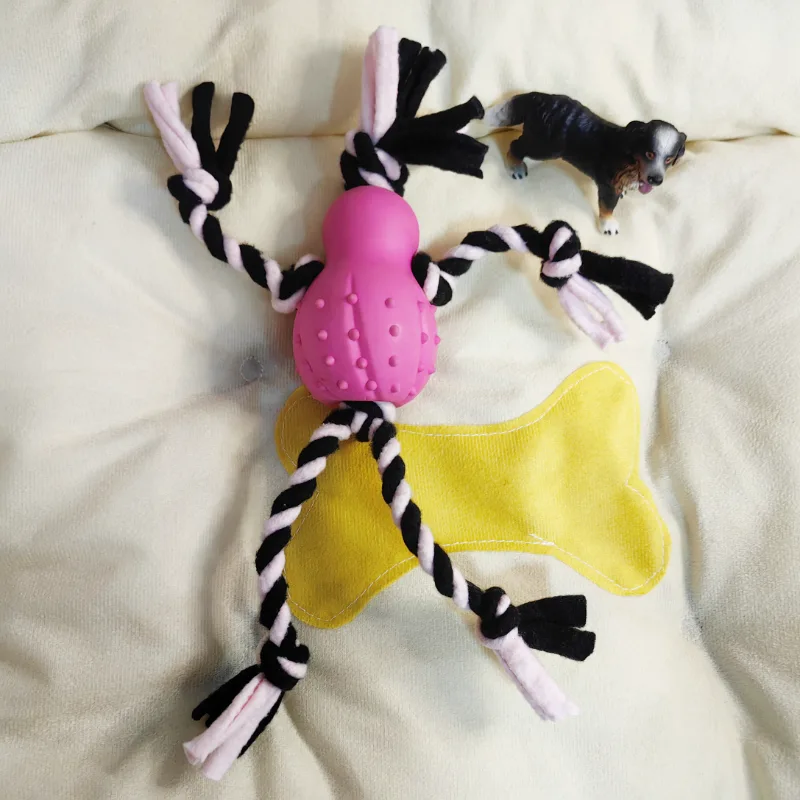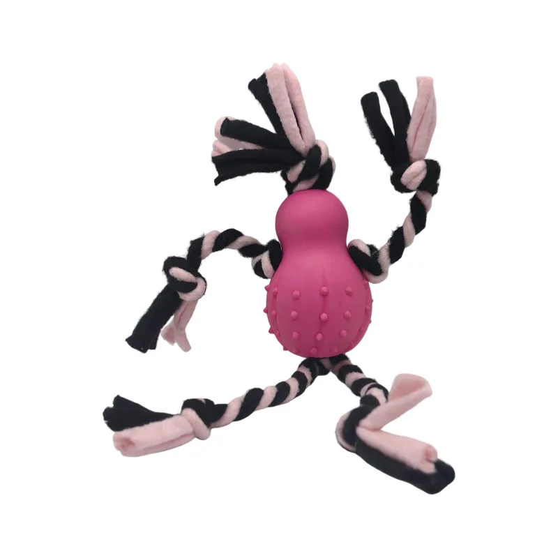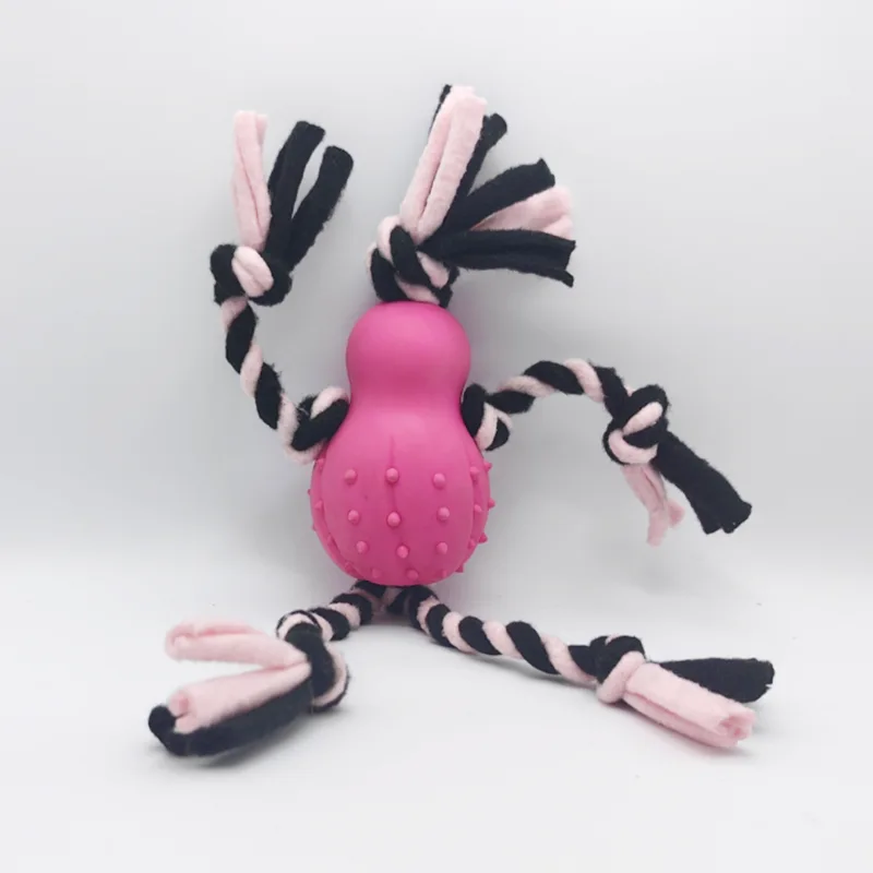 The puppy rope rubber body toys is expertly crafted from durable rubber, ensuring long-lasting play sessions. Its surface is adorned with small raised dots, providing dental benefits by promoting teeth cleaning and gum massaging during your dog's chewing and playtime.