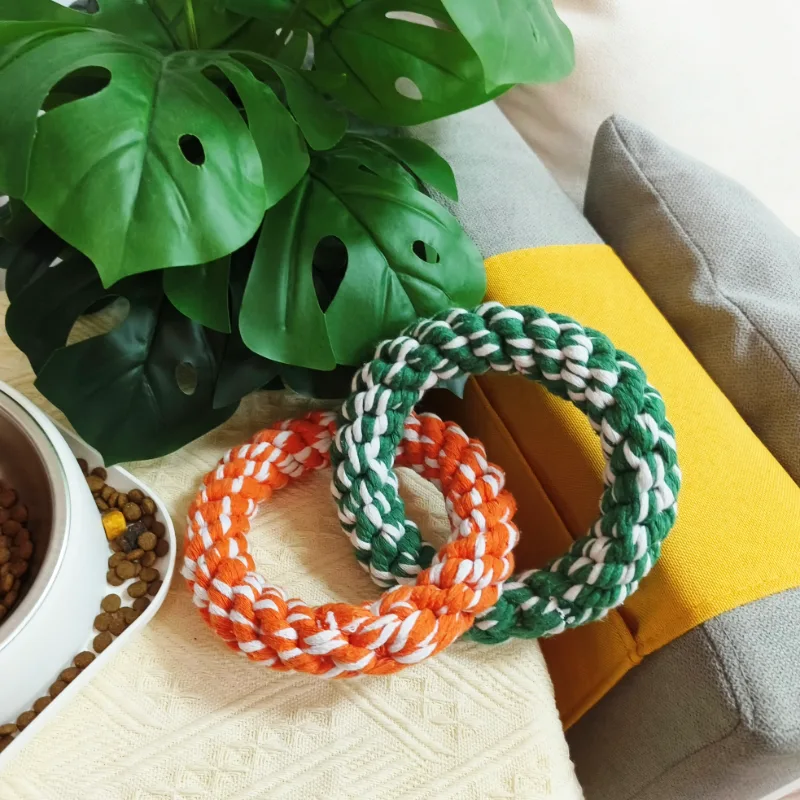 The recycled tug rope toy features a unique design, with two rings interlocking in a circle. This creative shape not only makes it visually appealing but also allows for easy interaction between you and your dog, as well as enabling two dogs to share the toy during play.