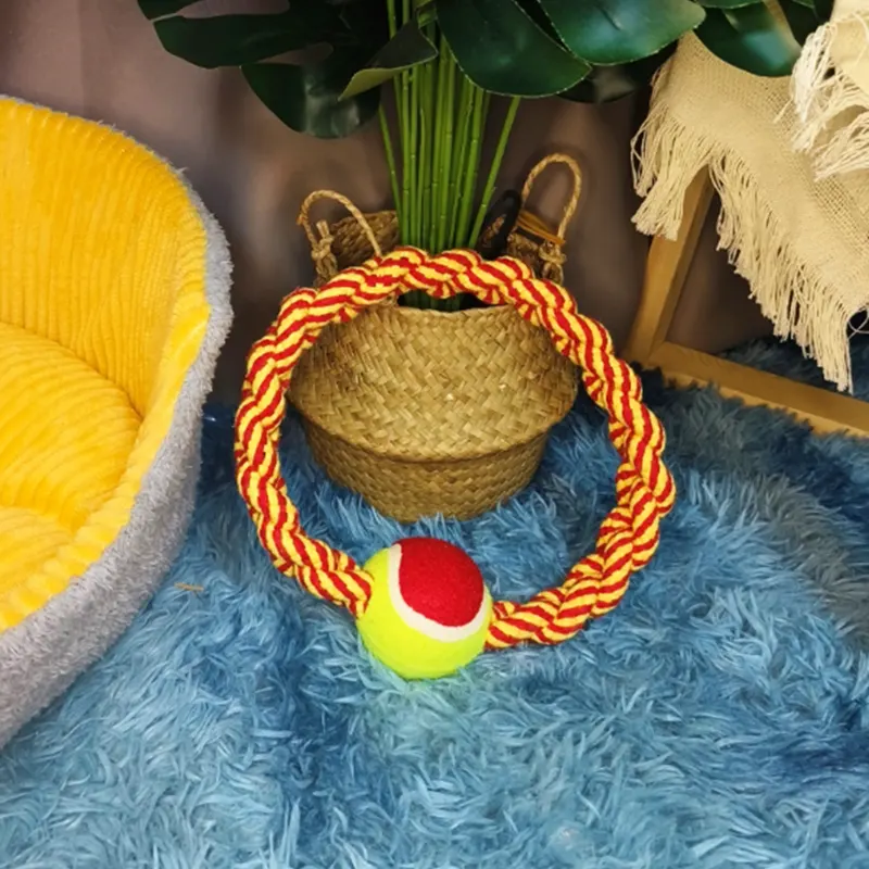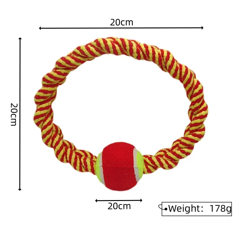 In conclusion, the rope toy for puppies is an exciting addition to your pet's playtime routine. Combining the allure of a tennis ball with the dental-cleaning benefits of a knotted ring, this toy will become an instant favorite for your furry friend. Watch as your dog's tail wags with joy while they play and interact with this delightful combination of fun and dental care!