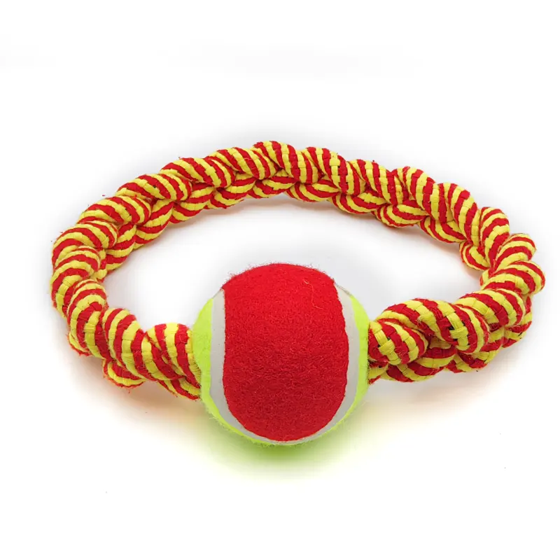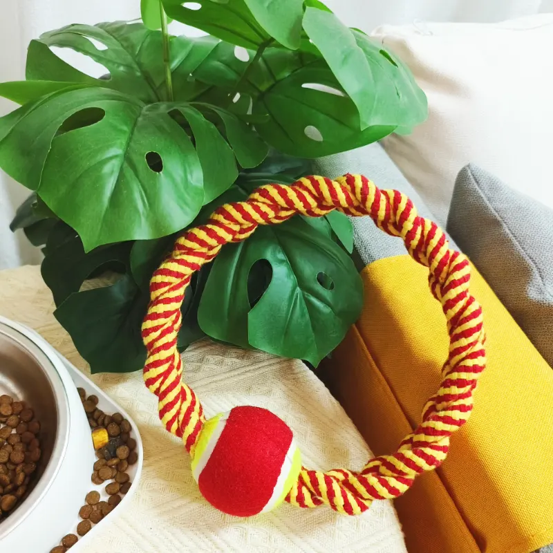 The rope toy for puppies boasts a brilliant design, with a tennis ball threaded through a durable knotted ring. This unique combination offers your dog multiple textures to explore and enjoy during play.