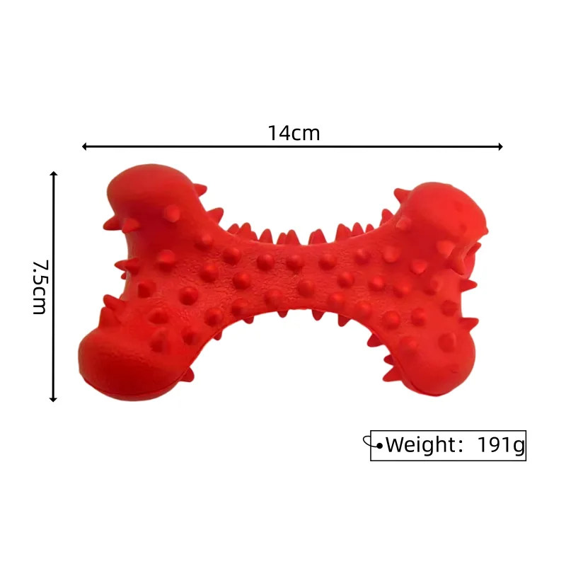 The spiky rubber dog chew toy boasts a strikingly lifelike design, meticulously crafted to resemble an actual bone. With attention to detail, this toy captures the essence of a bone, making it visually appealing and intriguing for dogs.