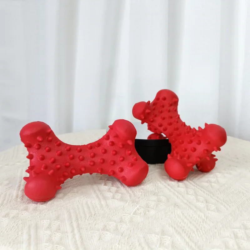 In conclusion, the red scented bone chew toy is a meticulously designed and visually striking toy. Its vibrant red color, textured surface with small spikes, and enticing scent make it an irresistible choice for dogs. The toy effectively serves as both a soothing solution for teething puppies and an engaging source of entertainment for dogs of all ages. Versatile for indoor and outdoor play, this toy is sure to keep your furry companion happily entertained and content during playtime.